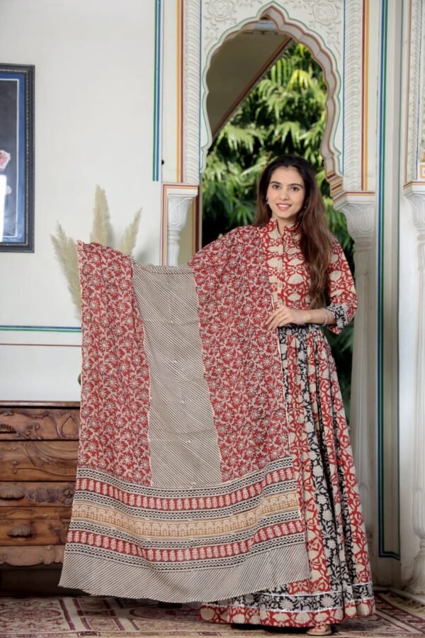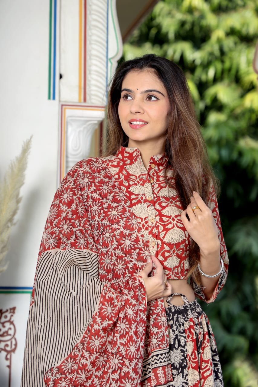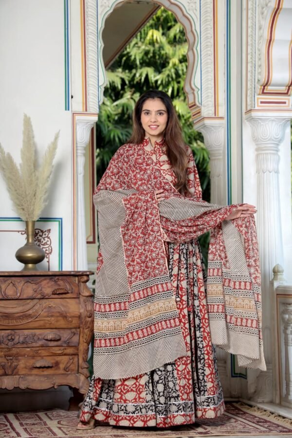 Bagru Hand Block Printed Designer Crop Top & Skirt With Mulmul Dupatta.Â