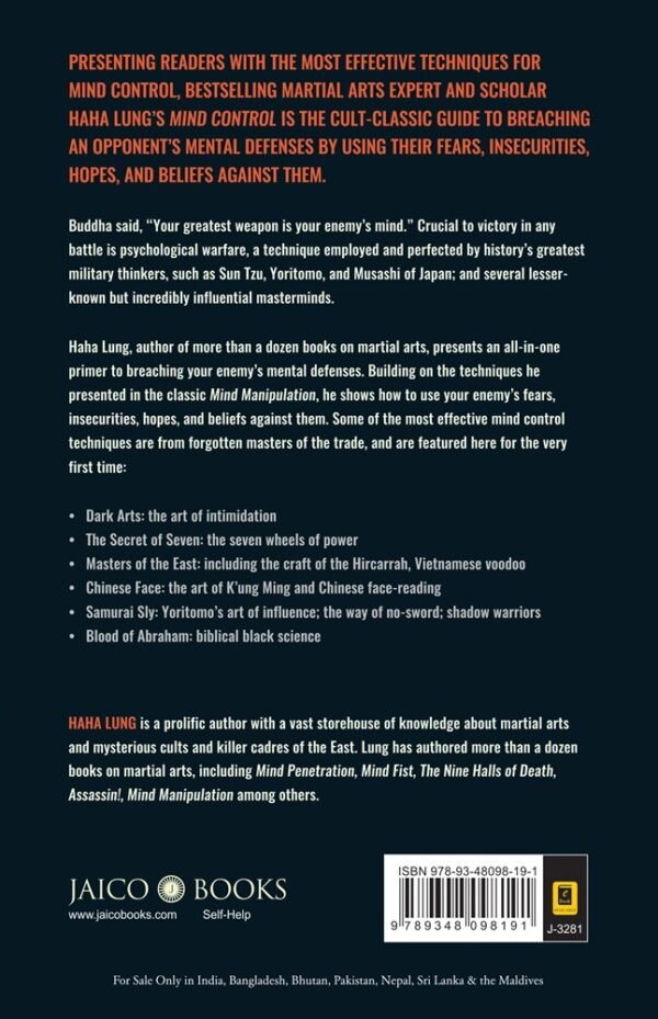 Haha Lung, author of more than a dozen books on martial arts, presents an all-in-one primer to breaching your enemy’s mental defenses. Building on the techniques he presented in the classic Mind Manipulation, he shows how to use your enemy’s fears, insecurities, hopes, and beliefs against them. Some of the most effective mind control techniques are from forgotten masters of the trade, and are featured here for the very first time: