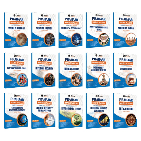 Elevate your Mains exam preparation with our exclusive study material ‘UPSC Prahaar Mains Wallah (Static + Current)’. This set of 15 booklets provides concise notes covering all essential topics, making it easier to grasp and retain the information. What sets us apart is the interlinking of current and static topics relevant for Mains, ensuring a seamless understanding of the subject matter. Our books are updated with the latest data and facts to reflect the latest information, and we’ve highlighted keywords to help you craft high-quality answers.